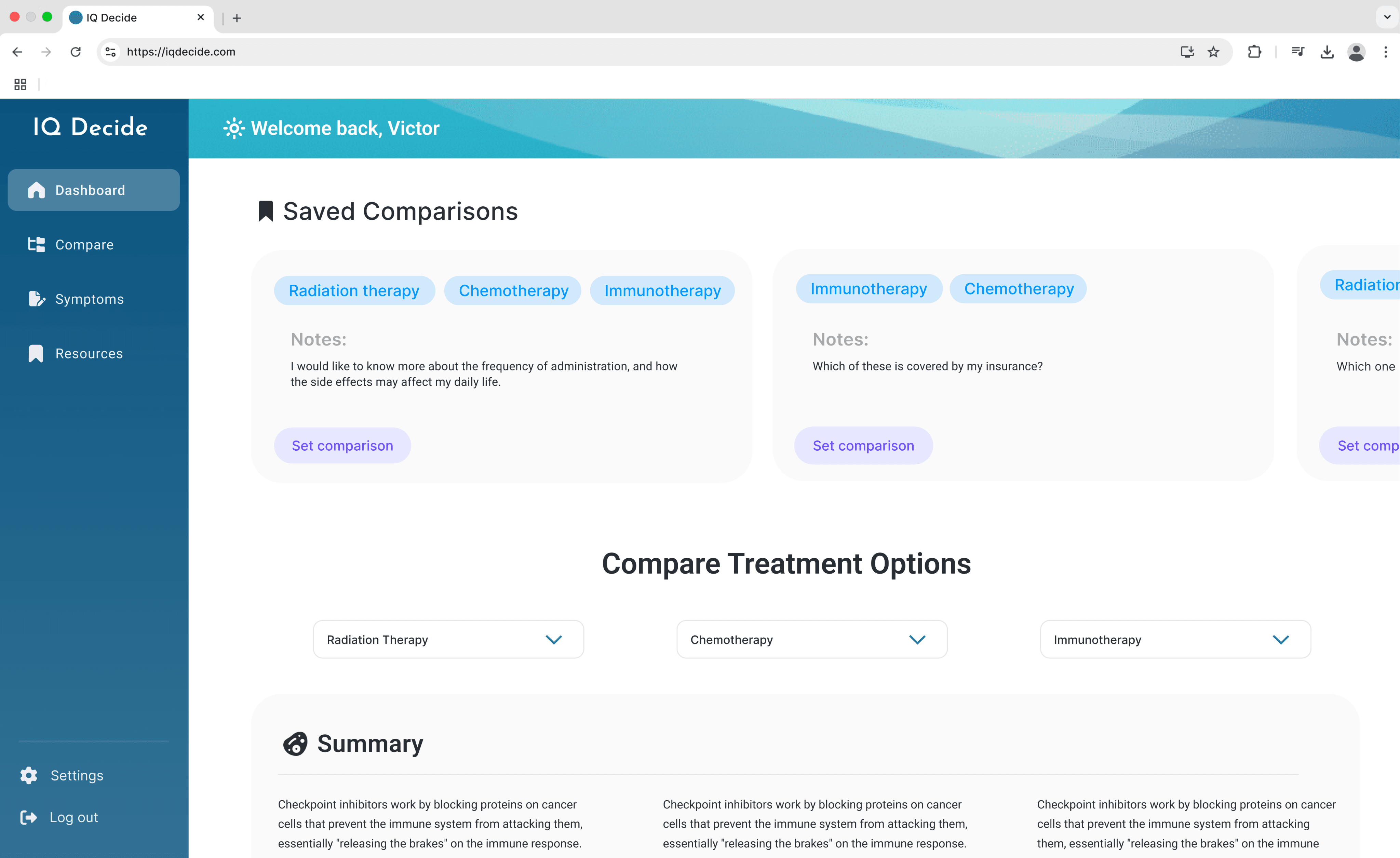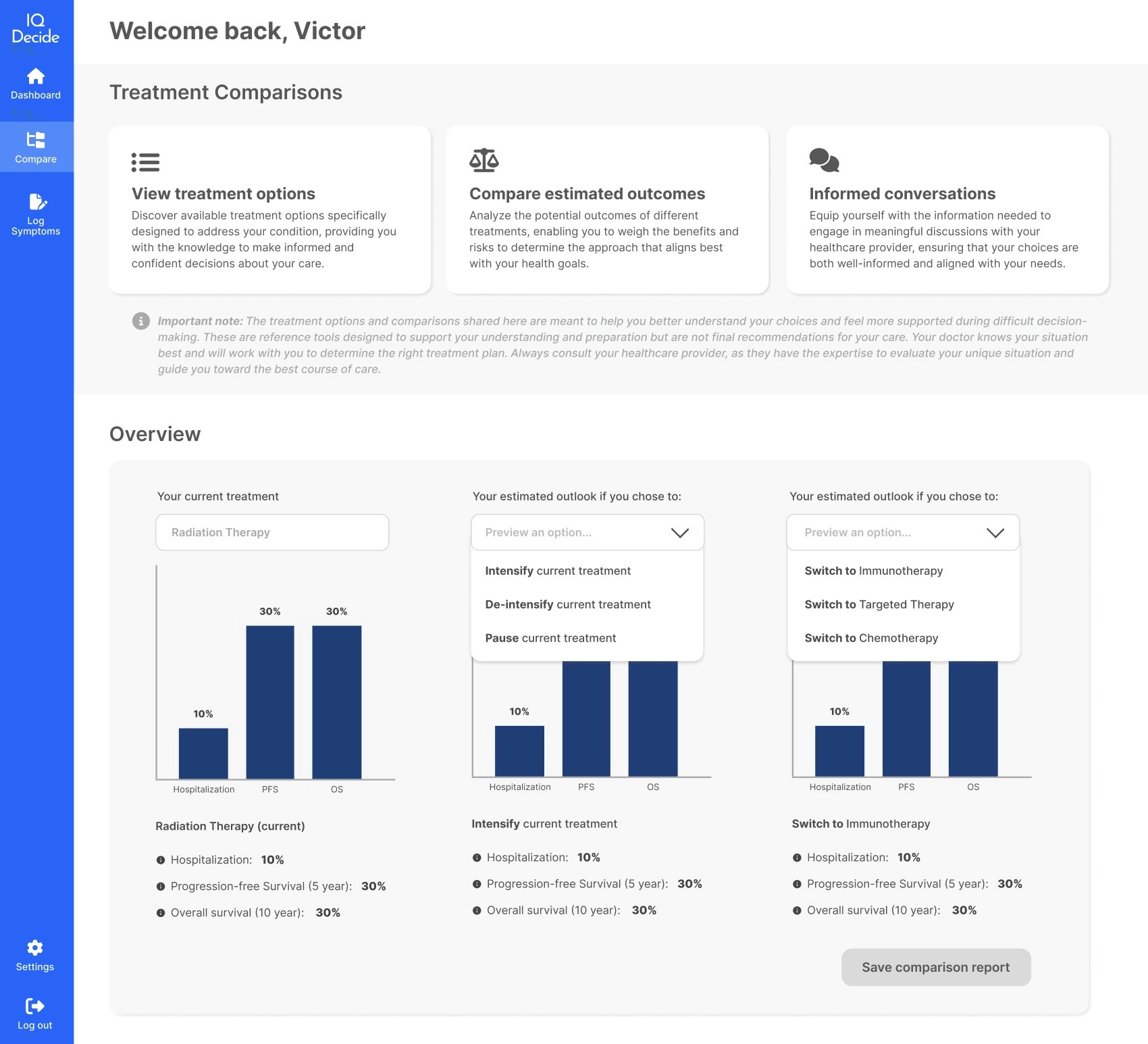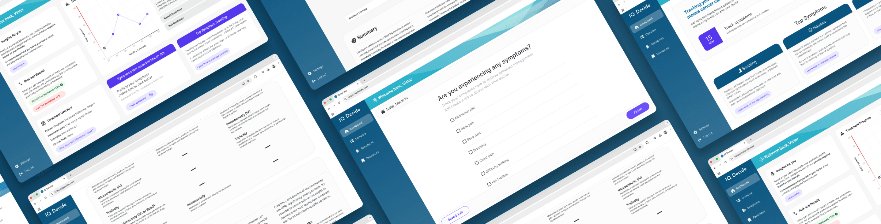 The patient side of IQ Decide needed to do three things: help patients understand their treatment progress, compare their options, and track how their body was responding.