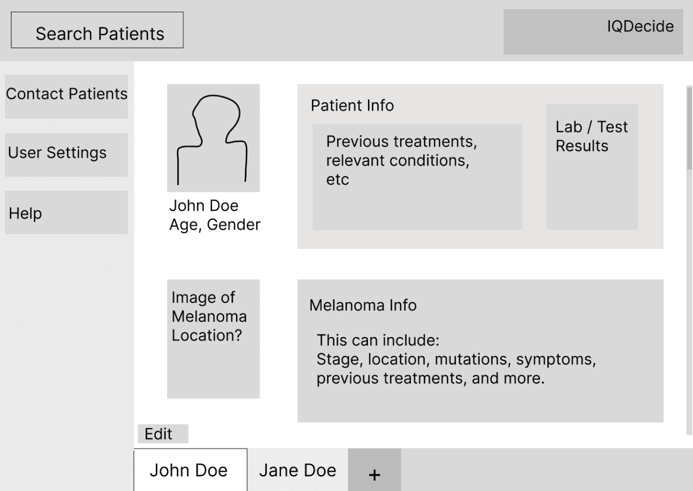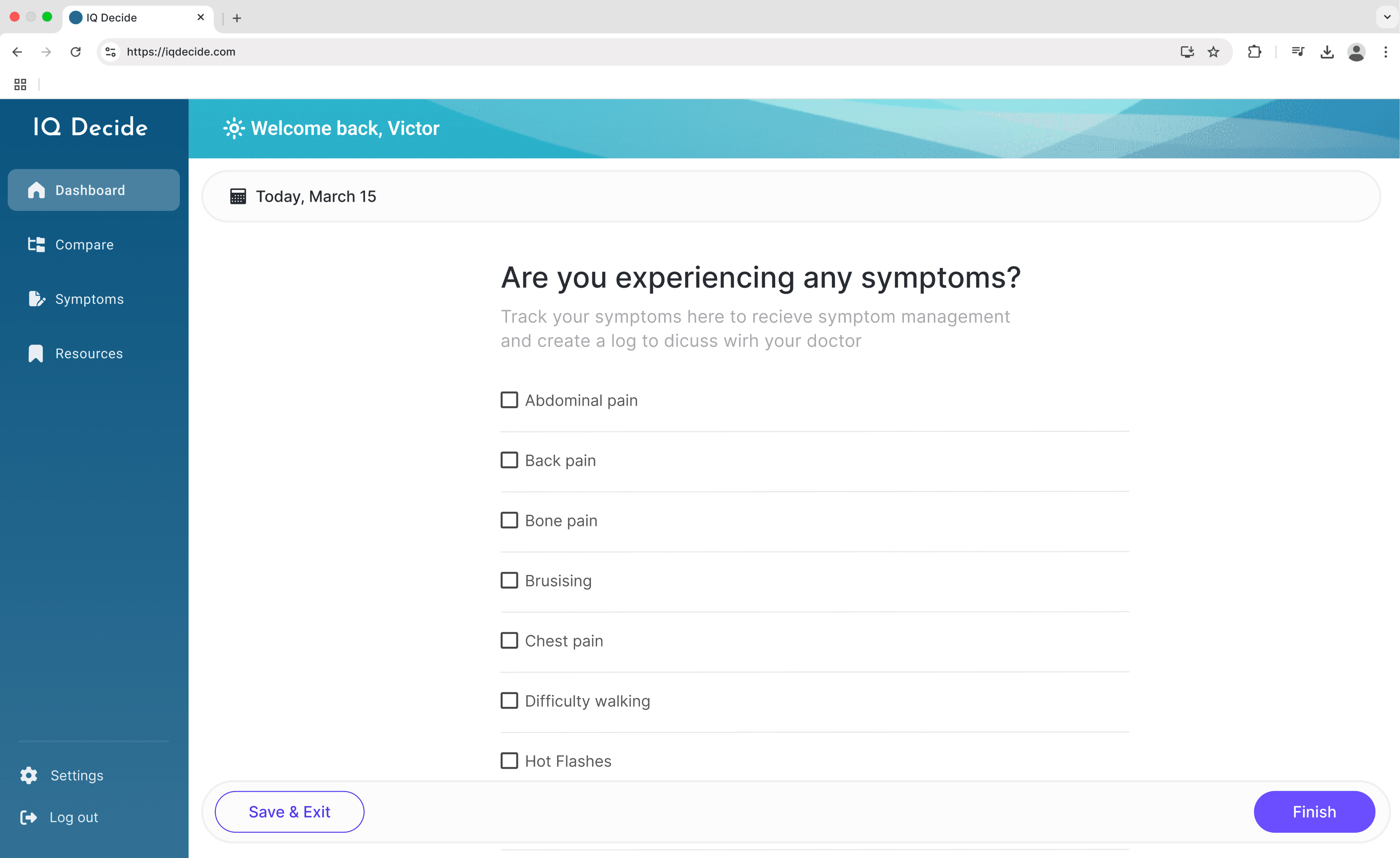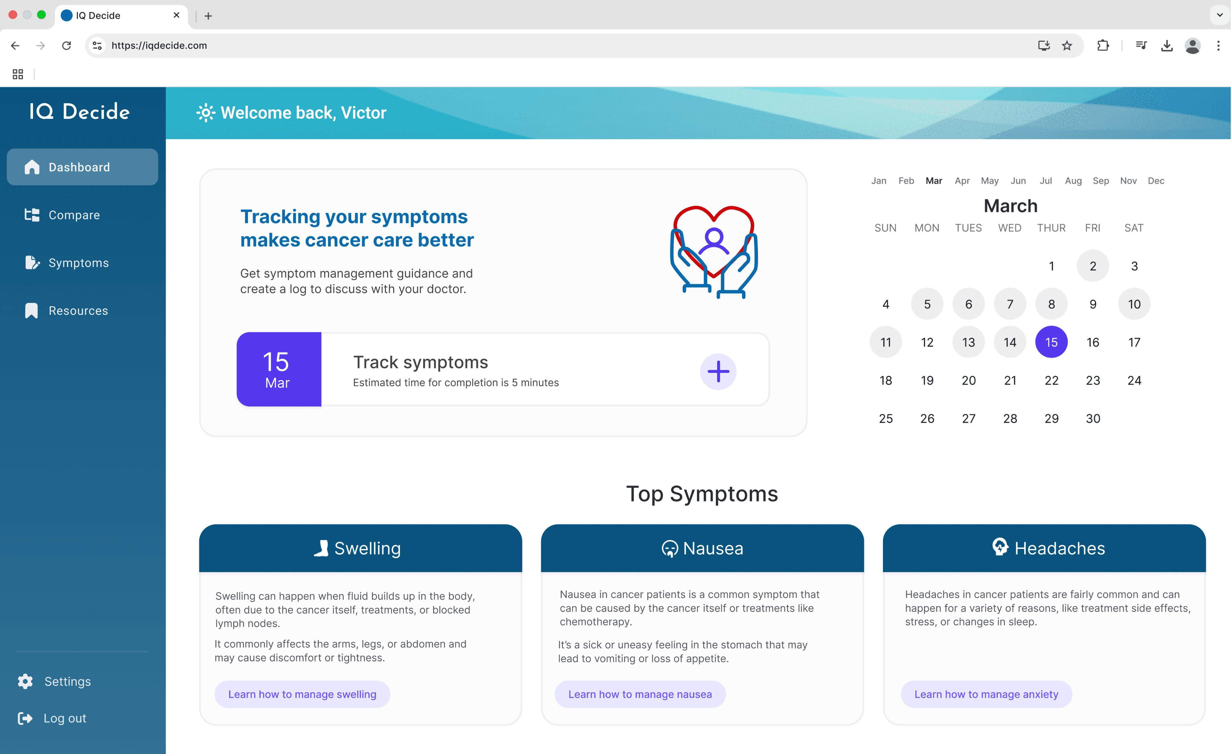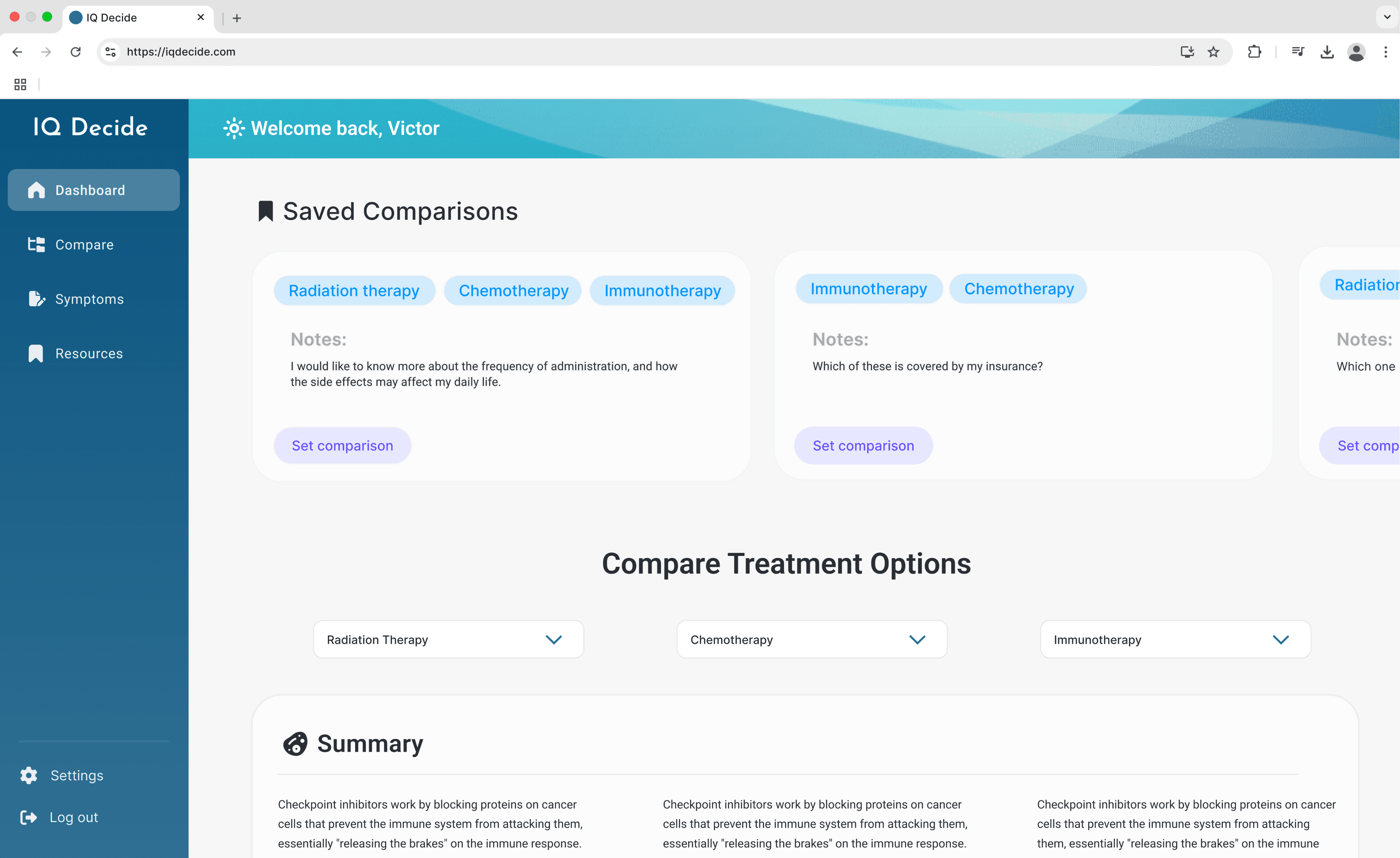 The patient side of IQ Decide needed to do three things: help patients understand their treatment progress, compare their options, and track how their body was responding.