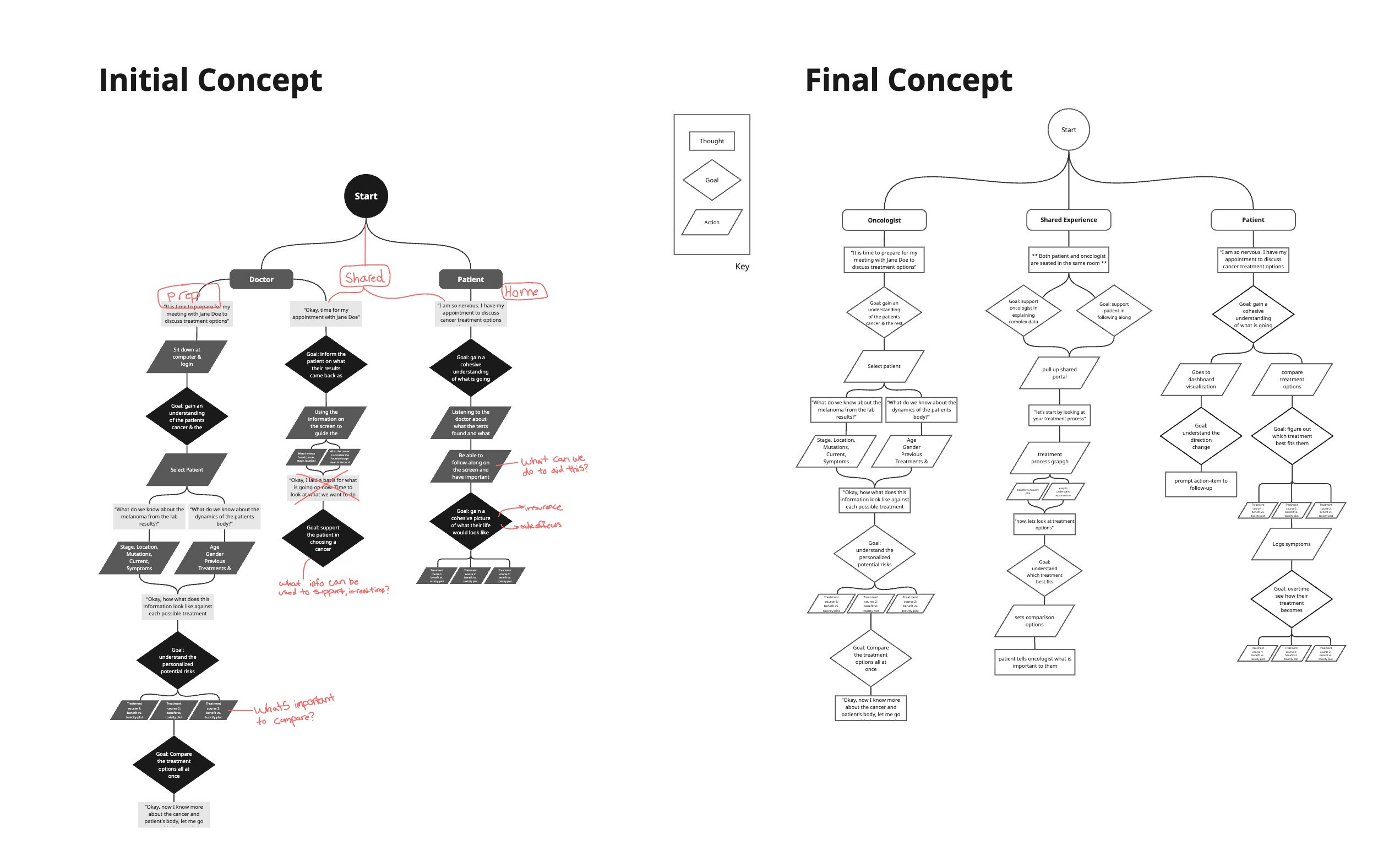 We mapped the full treatment decision journey from both the patient and doctor perspectives. This surfaced a key insight: both users needed the same core information, but at different moments and at different levels of detail.