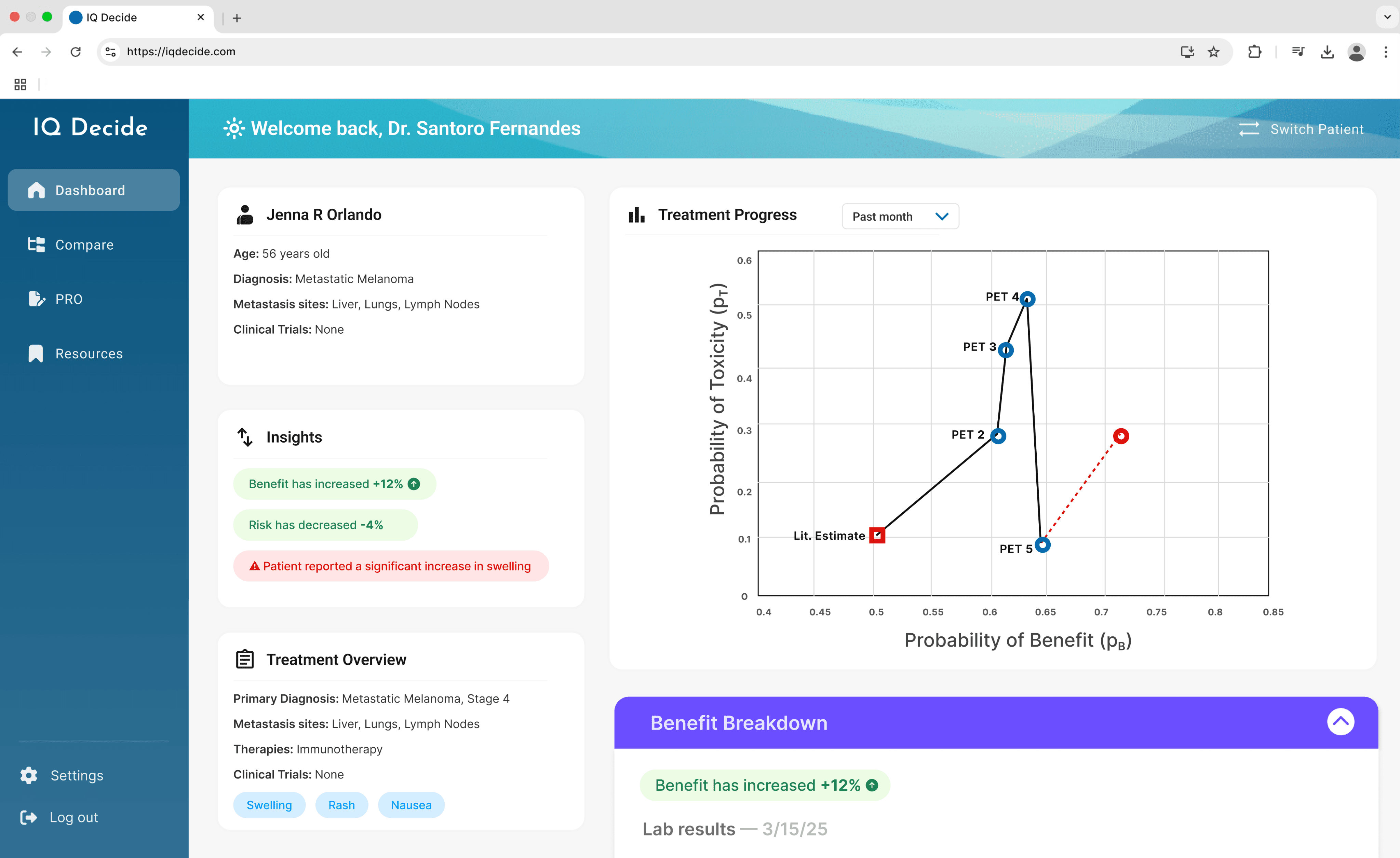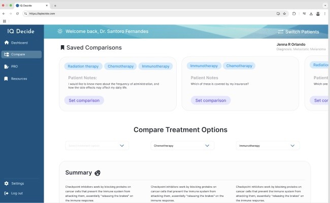 The startup's mathematical model could calculate personalized risk and benefit across treatment paths, but its only output was a research-grade scatter plot that neither patients nor oncologists could interpret. IQ Decide needed a portal that turned complex model outputs into something both audiences could understand, trust, and use to make decisions together.