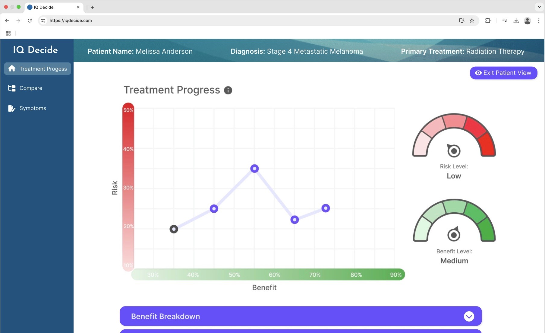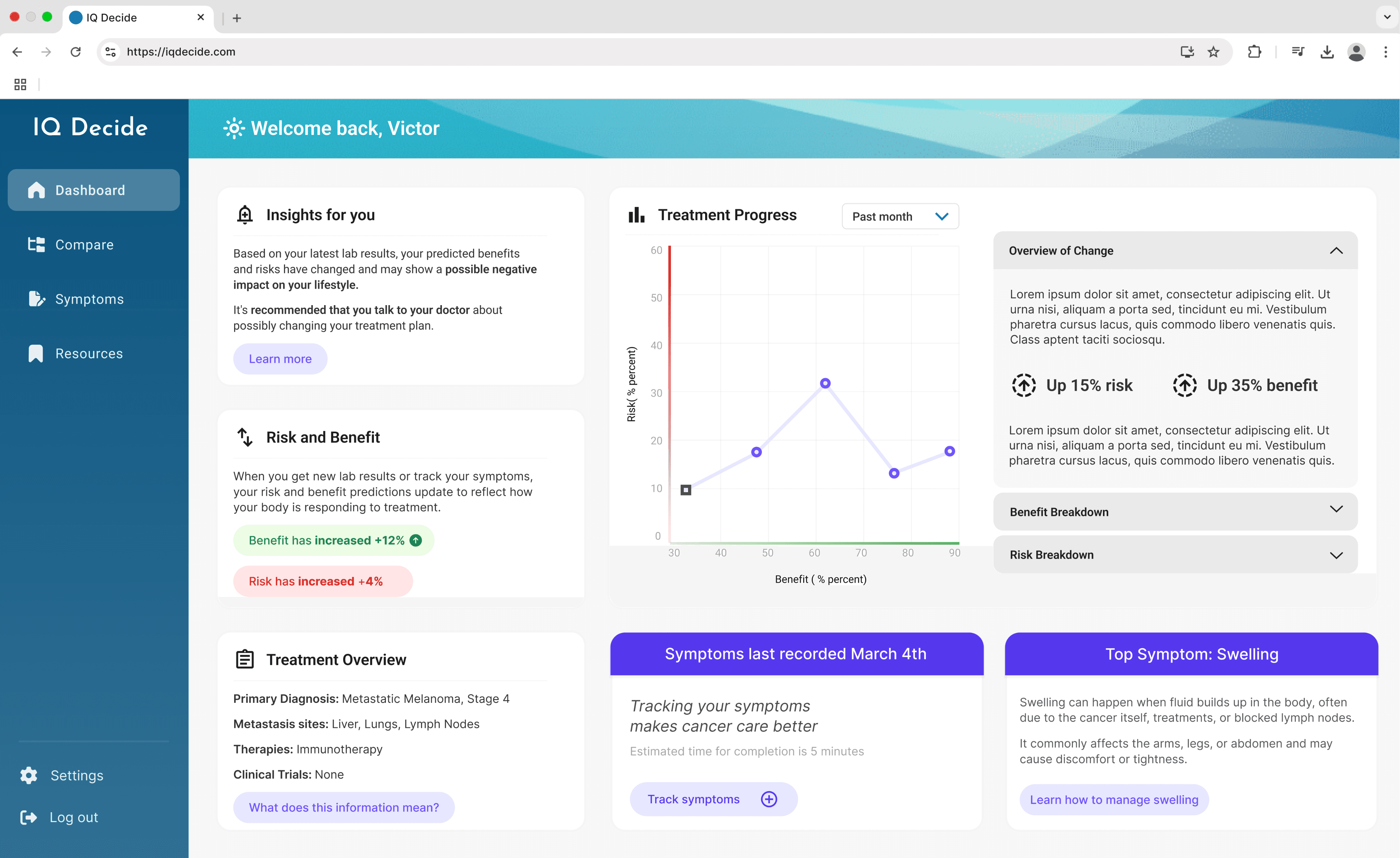 The dashboard is the first thing a patient sees after logging in. It hosts IQ Decide's core feature—a risk-benefit graph showing how a treatment is affecting the patient's health over time.