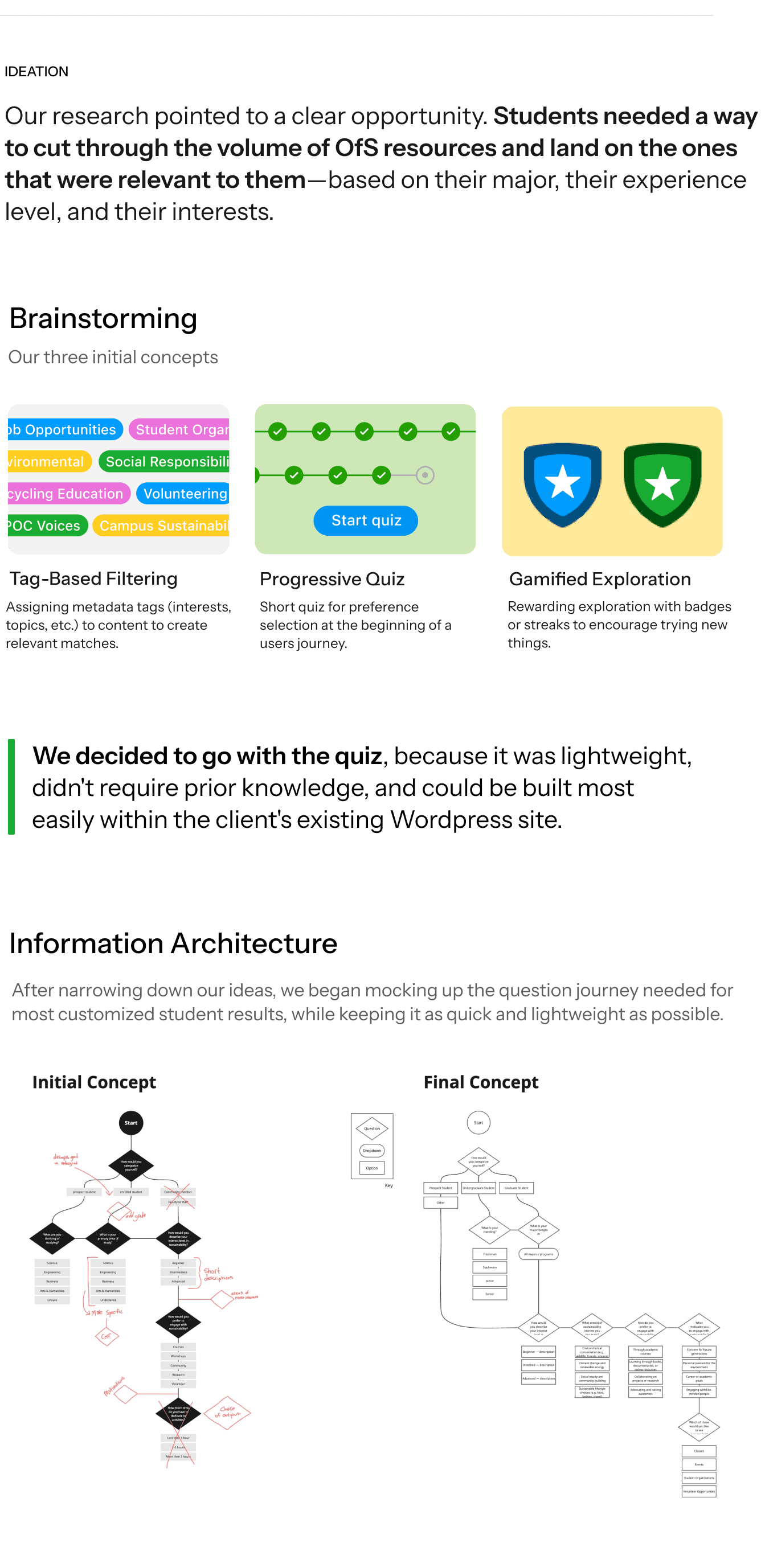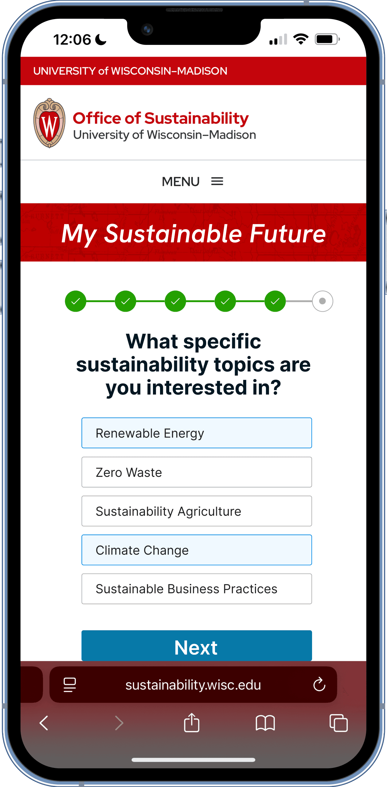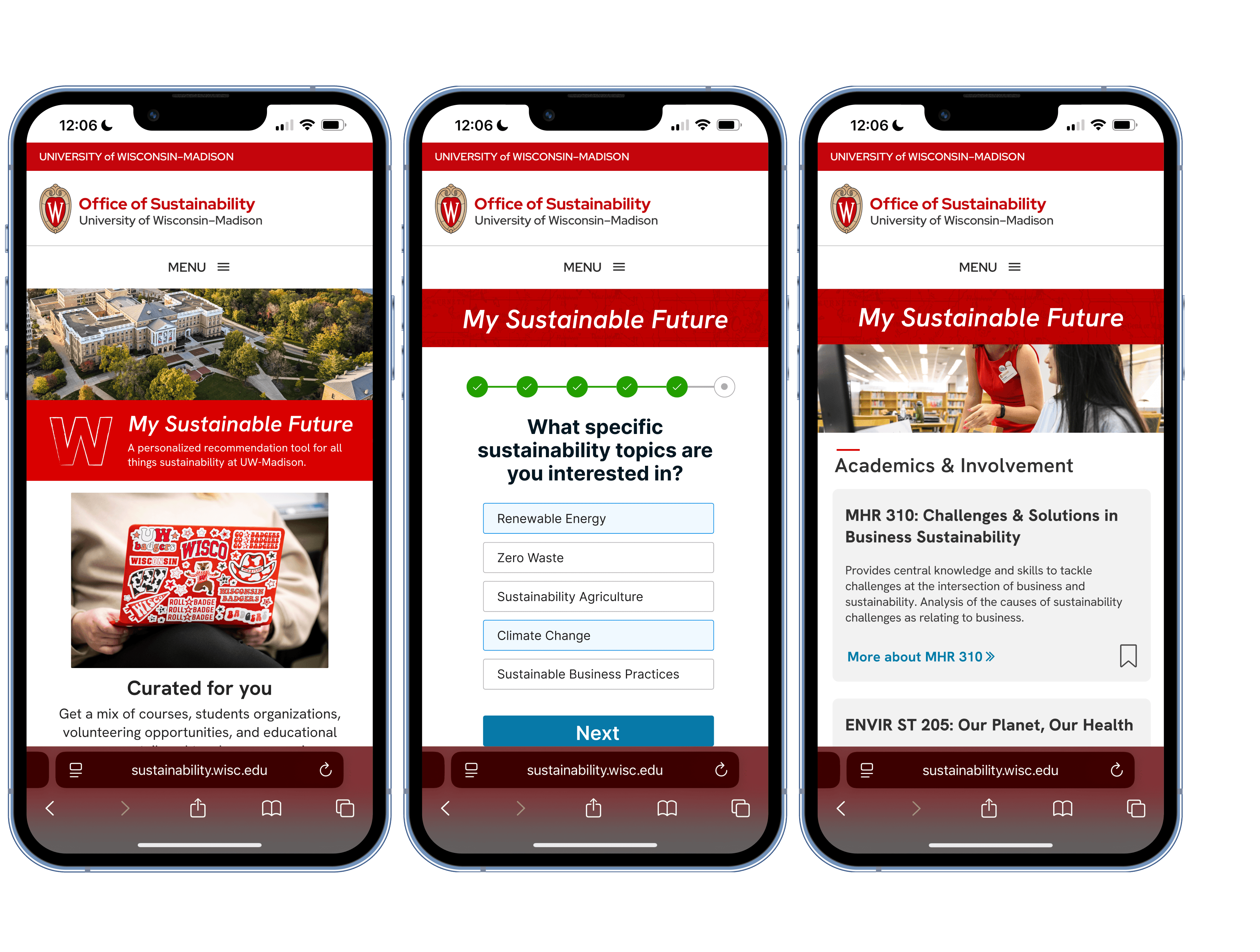 Led the design direction for a team of four, responsible for the My Sustainable Future tool—a quiz-based recommendation engine designed to personalize the sustainability experience for each student.