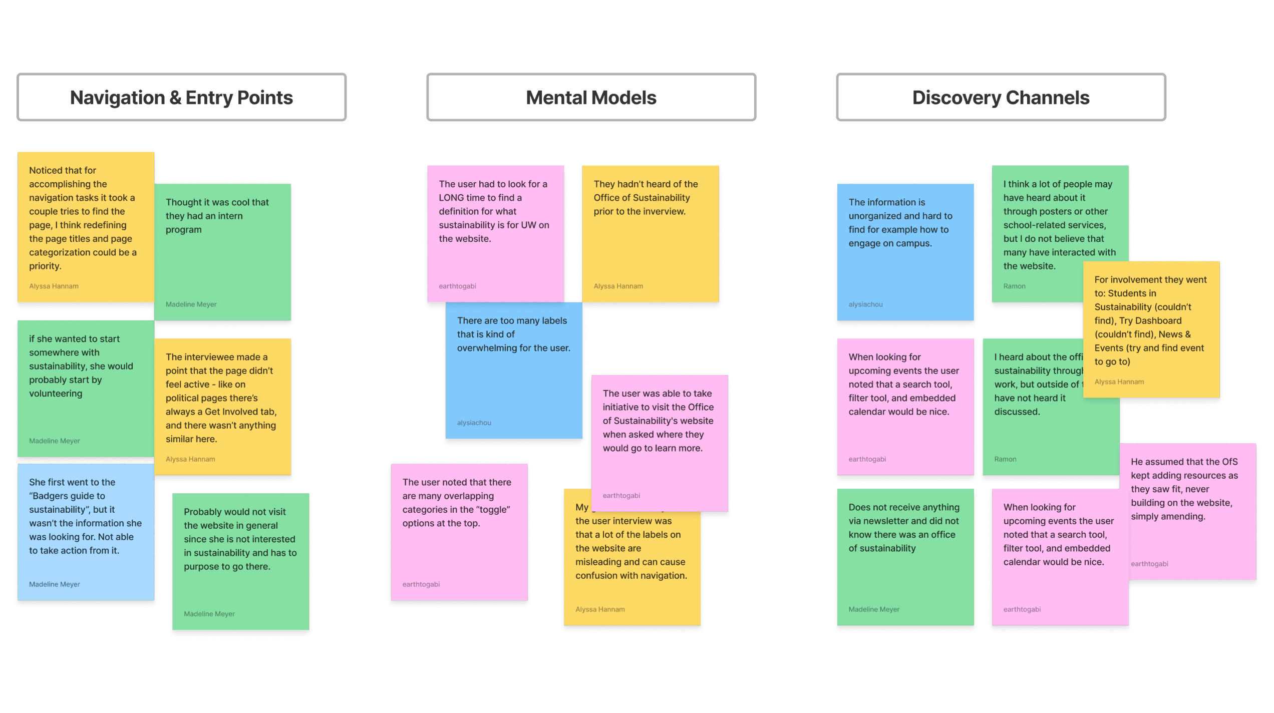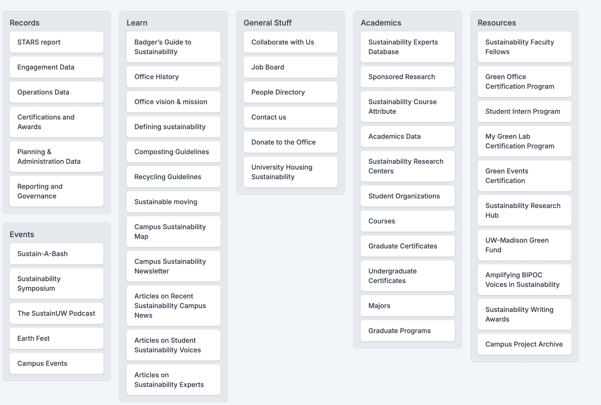 Using the our site audit, we synthesized content categories and ran card sorts to understand how students naturally grouped sustainability-related information.